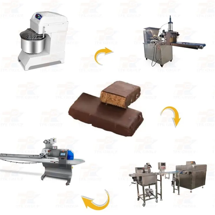 This protein bar production line including dough mixer, protein bar making machine,chocolate coating,cooling and packing machine